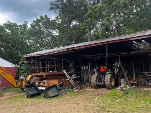 Our current equipment shed is in pretty sad shape. The roof is starting to sag, it’s falling apart, and it’s in desperate need of replacement. Our goal is to dismantle the current shed, build a new one that’s enclosed on three sides, and put new gravel down.